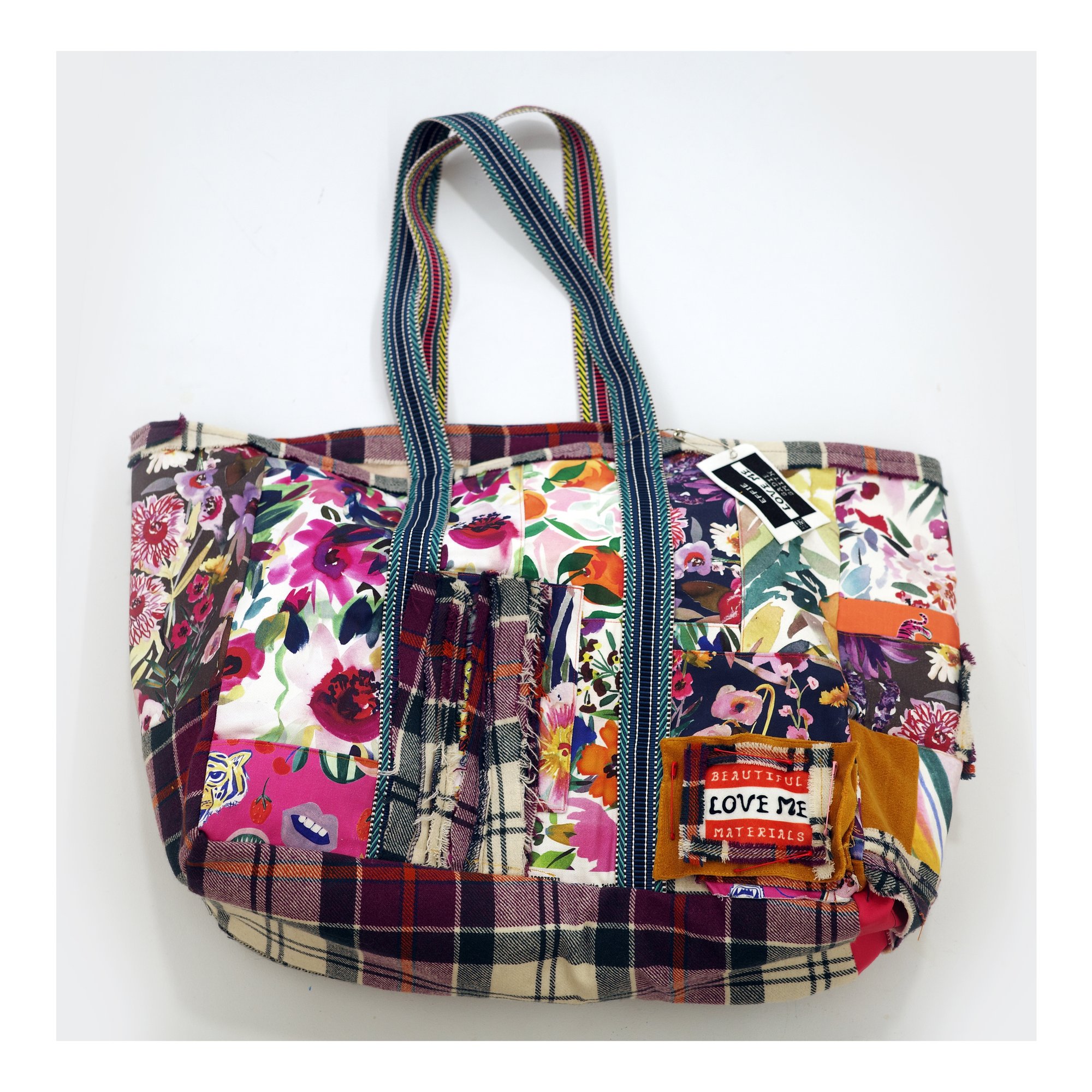 This bag comes from thinking about women’s work and the kinds of labour we are taught to value or overlook. Textiles, sewing, mending and patchwork; repetitive work that often goes unseen. I wanted to use unfinished projects offcuts and patches to lovingly re purpose remnants. Effie is made from fabric offcuts from my collections printed in Dundee on cotton drill, patched velvet and cloth with overlocked seams used as decorative detail from an unfinished skirt belonging to a friend’s late mum. I stitched the panels to show her original tacking, seam work and plaid structure while keeping the making visible. Everything was brought back together on the machine at my kitchen table. I enjoyed making her. (No swearing at the machine which is a first. ) There was no pressure on the outcome. Just patching cloth and working on my top stitching which reflects a desire to do, make and consume less and better. Treat her well. She will weather with love. No hot wash.